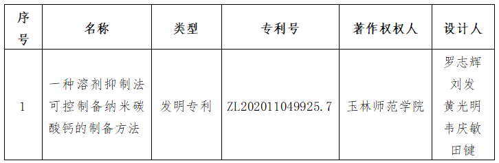 根据《关于科技人员取得职务科技成果转化现金奖励信息公示办法的通知》(国科发政〔2018〕103号)和《玉林师范学院技术转移和成果转化实施办法》(玉师院院字[2017]41号)等相关文件的规定,现对我校1项职务科技成果转化现金奖励相关信息公示如下: