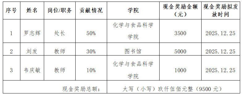 特此公示,公示期15个工作日,自2025年11月20日起至2025年12月10日。如有异议,请于公示期内以书面形式实名向校科研处反映。