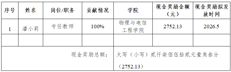 根据《关于科技人员取得职务科技成果转化现金奖励信息公示办法的通知》(国科发政〔2018〕103号)和《玉林师范学院技术转移和成果转化实施办法》(玉师院院字[2017]41号)等相关文件的规定,现对我校1项职务科技成果转化现金奖励相关信息公示如下: