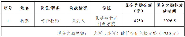 根据《关于科技人员取得职务科技成果转化现金奖励信息公示办法的通知》(国科发政〔2018〕103号)和《玉林师范学院技术转移和成果转化实施办法》(玉师院院字[2017]41号)等相关文件的规定,现对我校1项职务科技成果转化现金奖励相关信息公示如下: